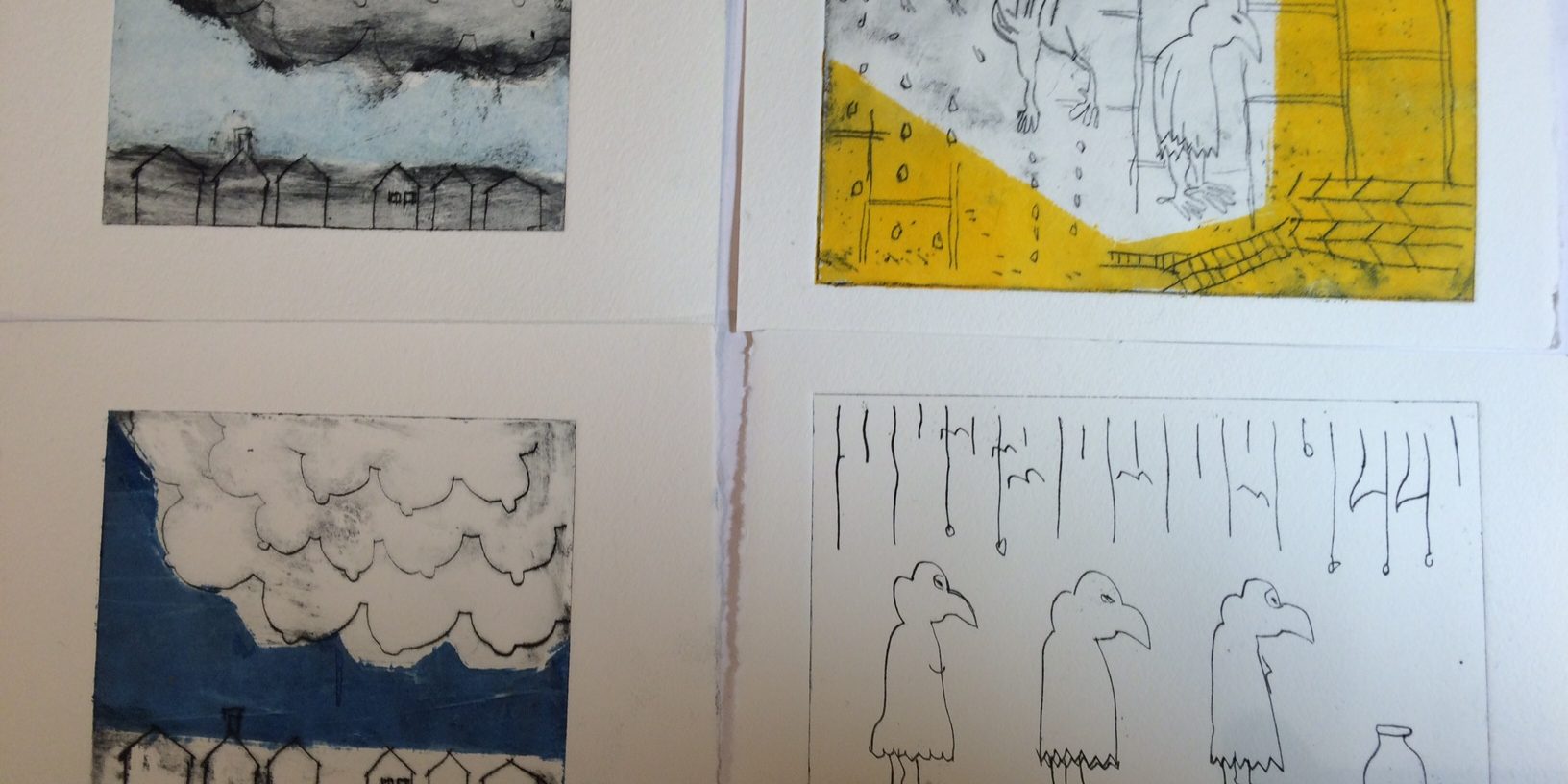 22 okt 2015. Tryckt grafik idag på Trelleborgs museum. Väldigt roligt. Väldigt annorlunda mot att skriva. Jag gick dit utan tankar på vad jag ville göra. Började teckna, det blev några fåglar. När jag tittar på konstutställningar frågar jag mig ofta vad bilderna betyder, vad konstnären velat säga. Nu hade jag en bild av tre fåglar på rad, så ritade jag dit en amfora framför dem. Varför? Jag vet inte, jag tyckte det skulle passa, jag ville inte säga något, det var bilden som saknade något där. Jag ritade också dansande bröst, bröst som ger tröst, det blev en linje, jag ville teckna något som mötte dem nedifrån, först något manligt, sedan blev det hus, och brösten gav mjölk från himlen. Skriva är ett tänkande, att göra bild sker med seendet, de växer fram efter vad jag ser.